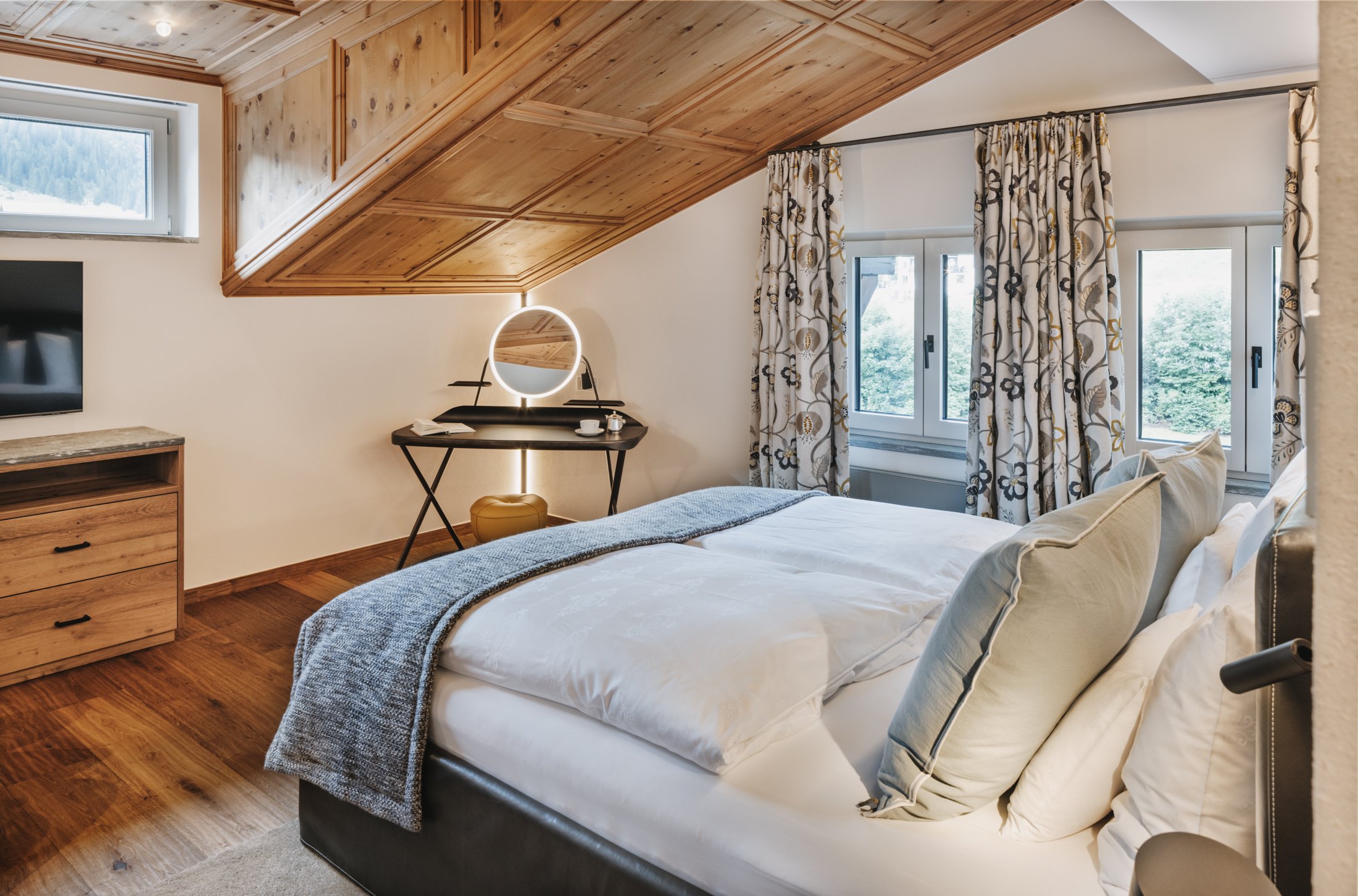Tauchen Sie ein in eine Welt des exquisiten Designs, des höchsten Komforts und der luxuriösen Ausstattung. Lassen Sie sich vom schimmernden Valser Quarzit, den natürlichen Stoffen aus Leinen und Loden sowie den eleganten Glasschiebetüren begeistern. Unsere seidenweiche Bettwäsche und das Natursteinbad mit exklusivem Agape Waschbecken und Badewanne versprechen puren Luxus. Genießen Sie die zusätzlichen Annehmlichkeiten eines komfortablen Bettsofas, eines Südbalkons mit atemberaubendem Ausblick, einem Schreibtisch und einer gut sortierten Minibar. Die sanfte, natürliche Farbgestaltung der Räume fördert Regeneration und Entspannung.
